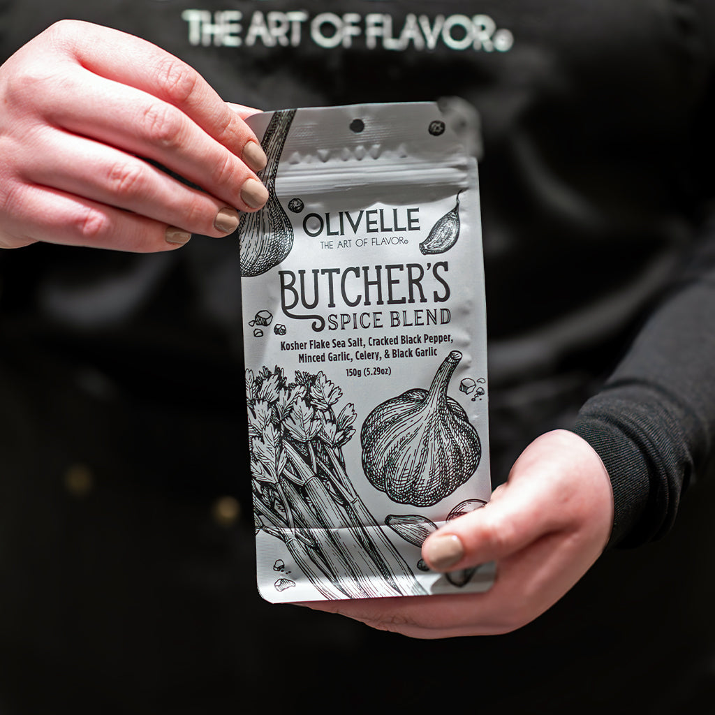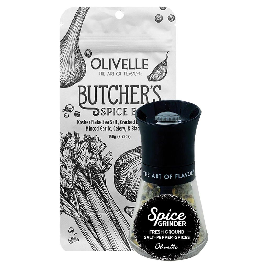 Grind or brine with Olivelle’s Butcher’s Blend Essentials. This seasoning salt combines coarse cut salt and peppercorns with aromatic garlic and herbs to provide an essential seasoning for any cook. Leave course and generously season meat and veggies or dissolve with water to create a brine. Add to a grinder to intensify the pungent flavors of pepper and garlic and delicate herbs to season eggs, salads, veggies, potatoes, or pasta.