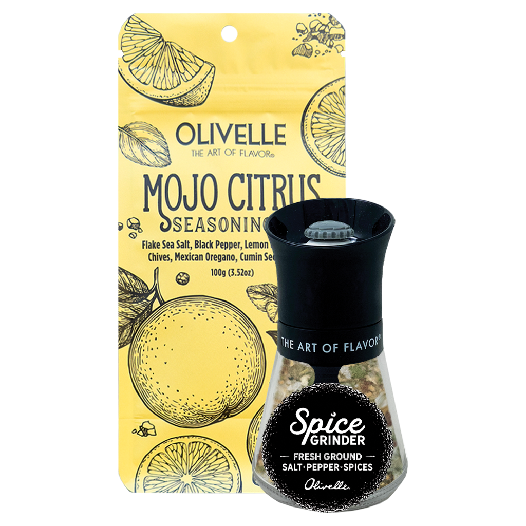 This Mojo Citrus Seasoning Salt blends Kosher Flake Sea Salt, Black Peppercorns, Lemon & Orange Peel, Chives, Mexican Oregano, Cumin Seeds, and Onion for a zesty, bright, and savory seasoning. Use to brine pork and chicken, season fish, veggies, beans and rice, or finish fresh salads!