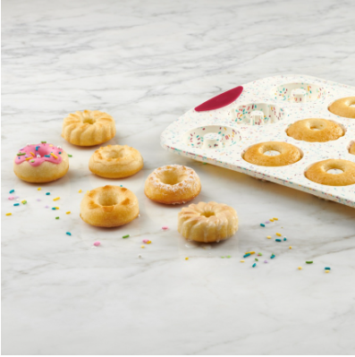 Previous NextBaking treats is a unique way of creating joyful memories for your family and friends. The Trudeau Structure Silicone™ 12 count Decorated Donut Pan is so easy to use, all you need to do is butter it, bake it and pop it out! Start baking worry-free : the pan is heat resistant up to 428°F/220°C! Part of Trudeau's proudly Canadian-designed baking tools, it features reinforced steel rims for secure handling. Baking recipes for the kids is always better with a non- stick and flexible tool which releases evenly cooked goodies every time. Discover perfection, right out of the oven! This donut pan is also microwave and freezer safe, whether you'd like to enjoy your treats now or later. Once you're done, just pop it in the dishwasher!